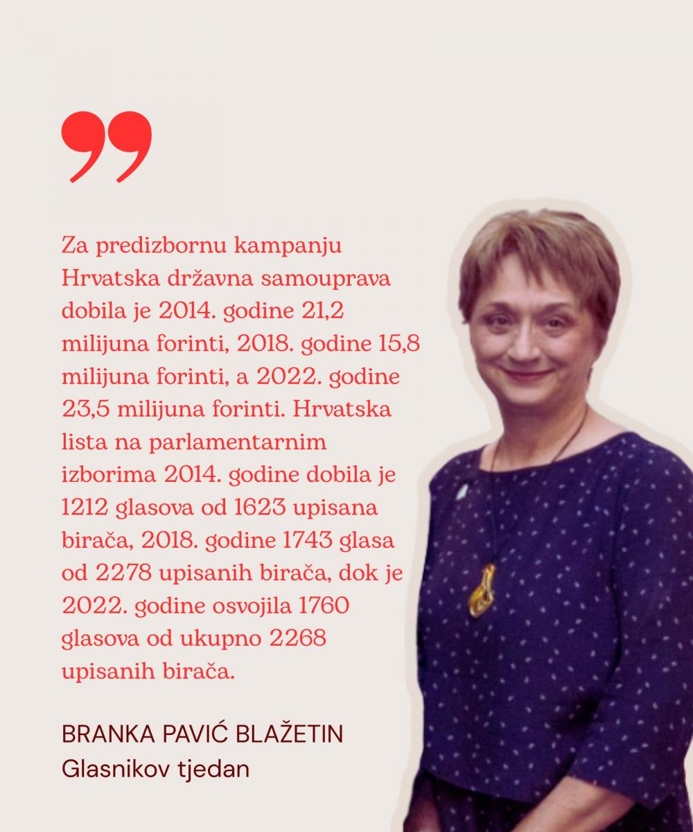 Za predizbornu kampanju Hrvatska državna samouprava dobila je 2014. godine 21,2 milijuna forinti, 2018. godine 15,8 milijuna forinti, a 2022. godine 23,5 milijuna forinti. Hrvatska lista na parlamentarnim izborima 2014. godine dobila je 1212 glasova od 1623 upisana birača, 2018. godine 1743 glasa od 2278 upisanih birača, dok je 2022. godine osvojila 1760 glasova od ukupno 2268 upisanih birača.