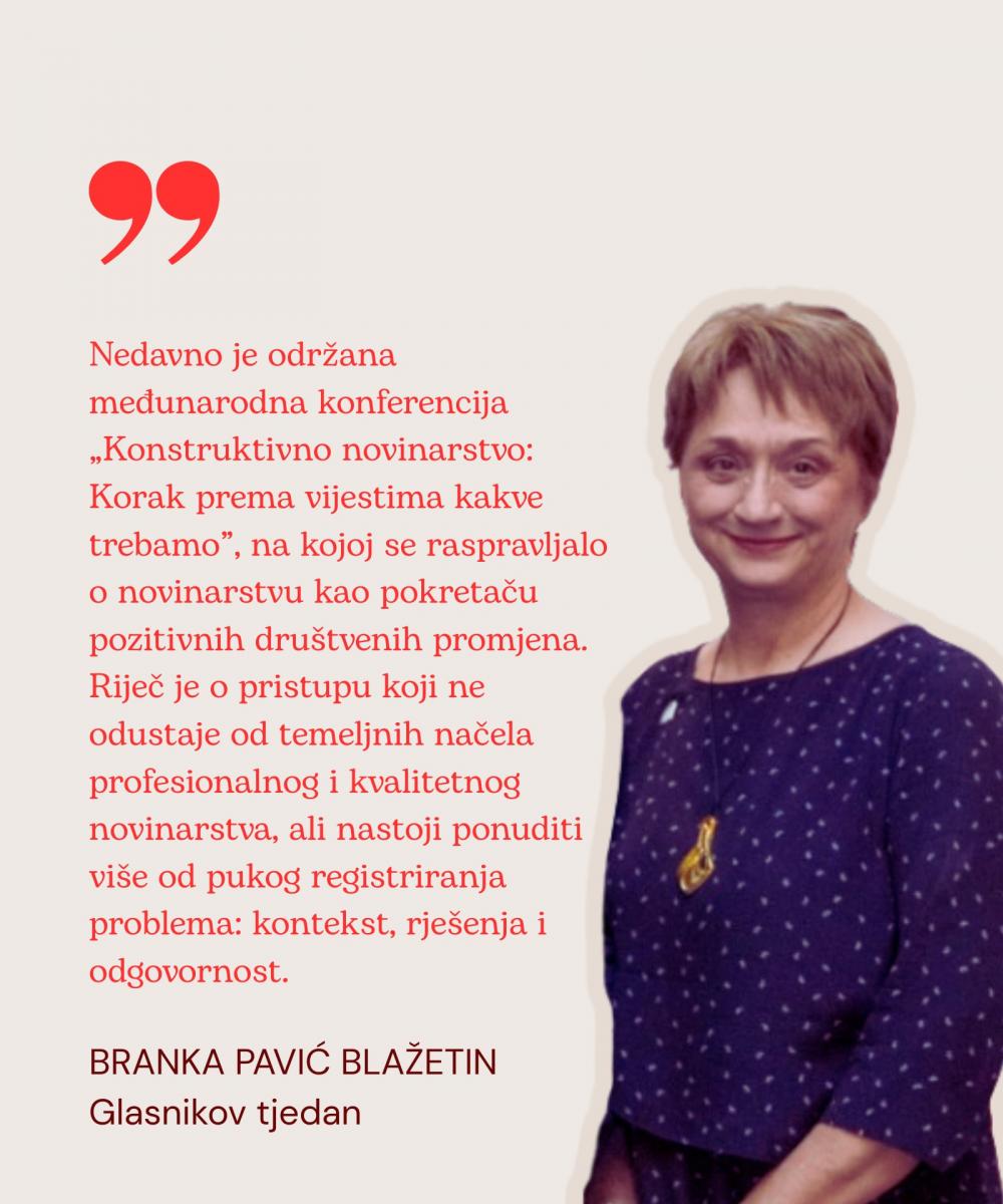Upravo s tom idejom nedavno je održana međunarodna konferencija „Konstruktivno novinarstvo: Korak prema vijestima kakve trebamo”, na kojoj se raspravljalo o novinarstvu kao pokretaču pozitivnih društvenih promjena. Riječ je o pristupu koji ne odustaje od temeljnih načela profesionalnog i kvalitetnog novinarstva, ali nastoji ponuditi više od pukog registriranja problema: kontekst, rješenja i odgovornost.