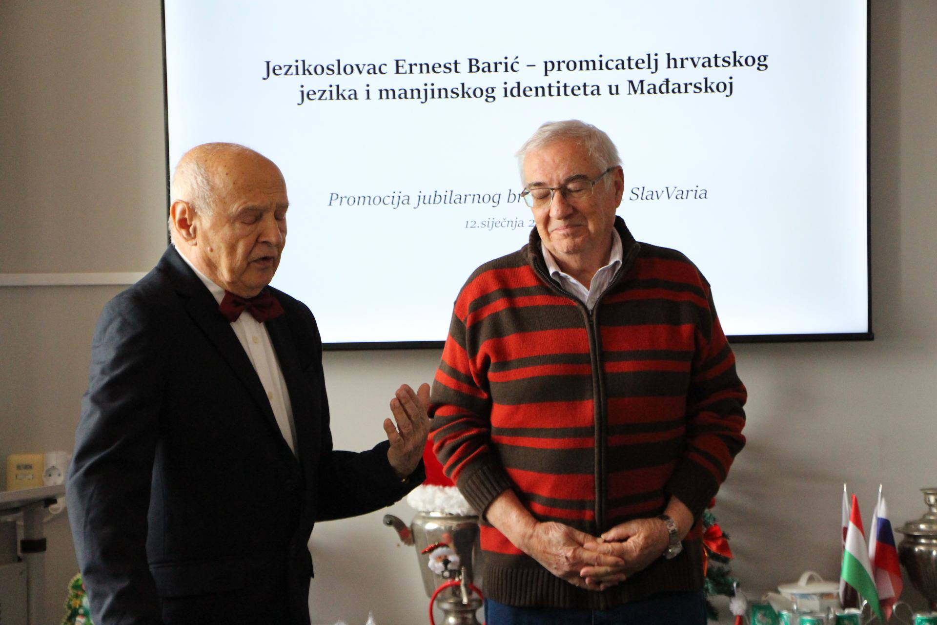 Naime, 12. siječnja priređena je svečanost njemu u čast i promocija jubilarnog broja časopisa „SlavVaria”, koji izlazi već pet godina. Jubilarni broj, objavljen u povodu 80. rođendana prof. Ernesta Barića, tiskan je uz potporu Znanstvenog zavoda Hrvata u Mađarskoj. Riječ je o časopisu Instituta za slavistiku Filozofskog fakulteta Sveučilišta u Pečuhu. Poseban broj, posvećen prof. Ernestu Bariću, uredili su Tímea Bockovac, Marina Povarnyicina i István Pozsgai.